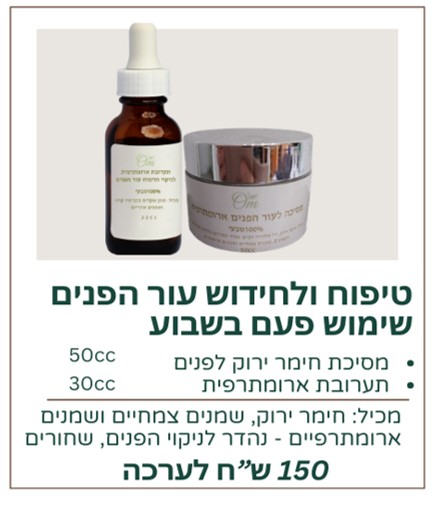 מסיכה מדהימה בסגולותיה ובחידוש עור הפנים בנוסף תערובת ארומתרפית עם שמנים צמחיים ושמנים אתריים אותה מורחים לאחר מריחת המסיכה על הפנים.