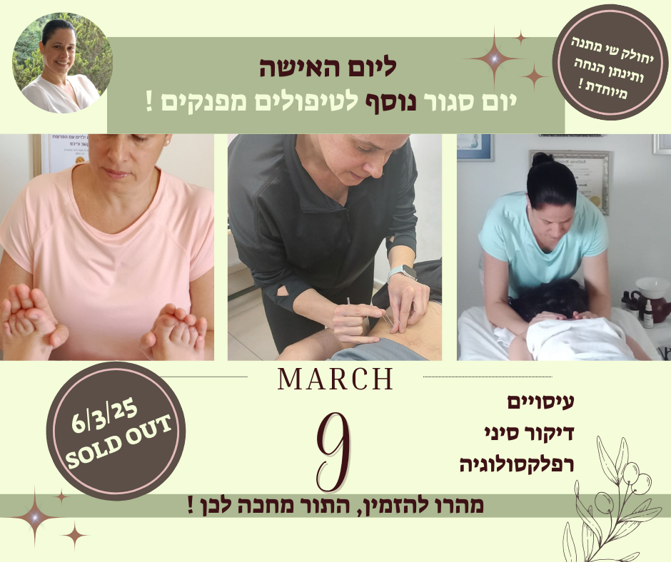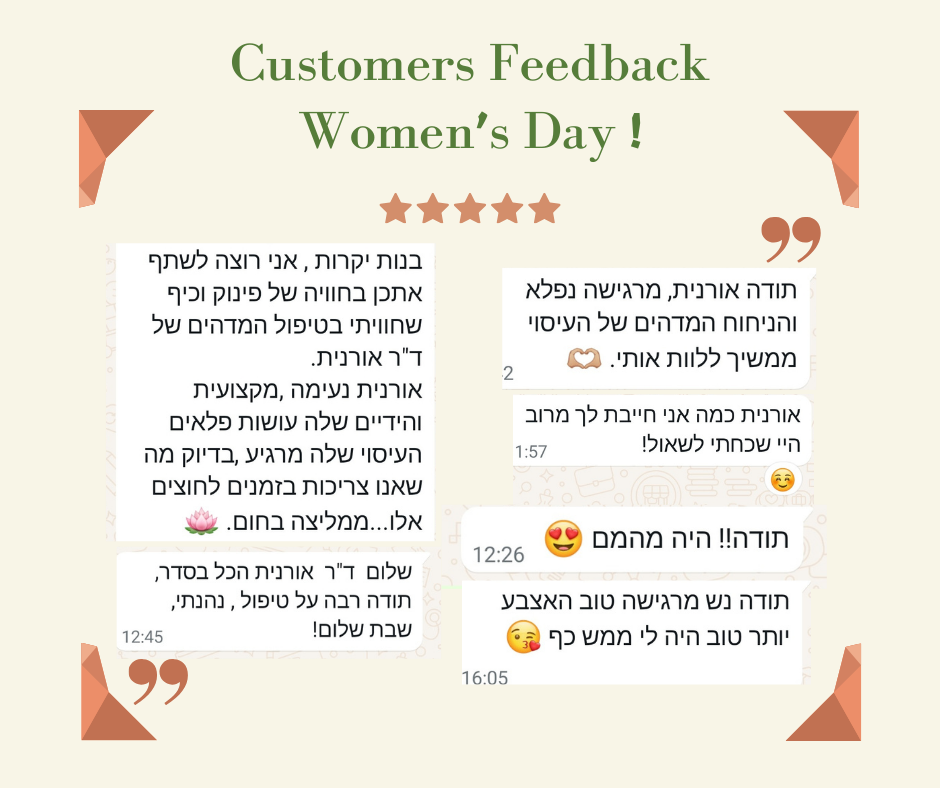 ✅ביום האישה הבינלאומי, הקליניקה התלבשה בפרחים אדומים ובארומה של שמנים אתריים, קבלנו את פניהן של הנשים בשתיה וכיבוד, כל אישה קיבלה עיסוי ושי מתנה ברקיחה טבעית הישיר מהבית שלנו – בשל הביקוש נוסף עוד יום מלא של טיפולים מפנקים